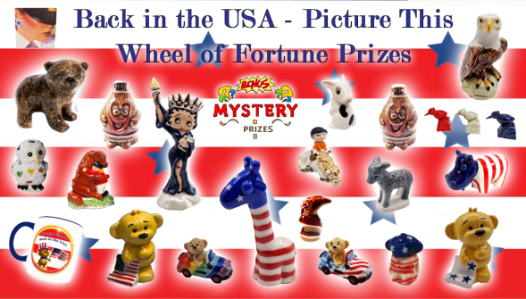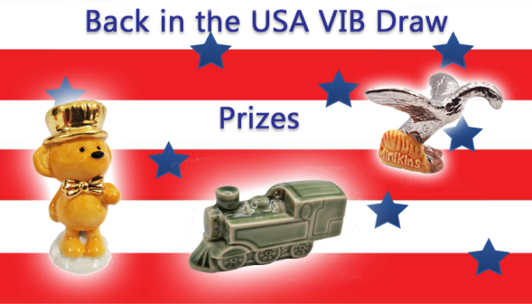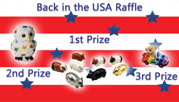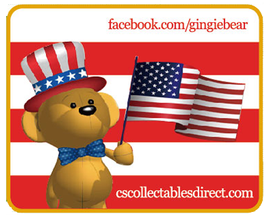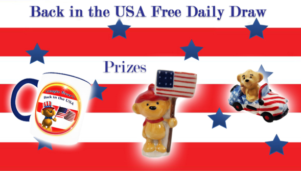 USA Police Woman Tile, American Eagle, American Brown Bearcub, Billy Bottle Oven Hand Painted Face and Gold Top 1 of 20, Billy Bottle Oven Hand Painted Face Silver Top 1 of 20, Liberty Betty Boop Figurine, Bounce Pocket Pal, Red Kingfisher Whimsie, White Kingfisher Whimsie, Blue Kingfisher Whimsie, Athena Love Hearts Owl Minikin 1 of 20, Thelwell Big Hug Brown Pony, Thelwell Sleepy Head Gold Special 1 of 20, Dash the Little Donkey Minikin, USA Stars and Stripes Hugo Hippo, Back in the USA Gingie Bear Mug, Gingie Bear Whimsie Carrying a USA Banner, Gingie Bear Whimsie Carrying a Stars Banner 1 of 20, Gingie Bear Racer Rainbow Minikin 1 of 20, Tiny Giraffe USA Decoration, Brown Eagle Whimsie, Gingie Bear Racer Back in the USA Minikin, Gingie Bear USA Charm Plus Mystery Prizes and Mystery Whimsies. Good luck to all those who enter.