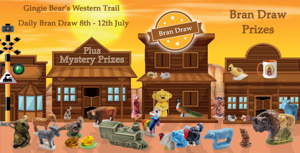 Don't miss Gingie Bear's Western Trail Daily Bran Draw. Prizes are as shown in the picture above. Pocket Pal Mouse, Jaz Little Donkey Minikin, Dash Little Donkey Minikin, Skip Dog Whimsie, Grey Pheasant Whimsie 1 of 20, Snake Skin Frog Whimsie 1 of 20, Yellow Frog Whimsie, Survival Buffalo, Pink with gold Detail Meerkat Whimsie, Sample Train Wade Archive Model, Rainbow Little Donkey Minikin, Gold and Silver Hamster Whimsies 1 of 20 pairs, Gingie Bear Love Heart Banner 1 of 20, Pheasant Whimsie, White Turkey Minikin, Sky Blue Turkey Minikin, Grey Hand Painted Turkey Minikin, Sky Blue Piglet Whimsie, Hollow Sample Field Mouse, Sky Blue Little Donkey MInikin, Cardinal Colourway Whimsie 1 of 20, Pair Hamster Whimsies, Western Trail Exclusive Mug, Meerkat Whimsies plus Mystery Prizes.